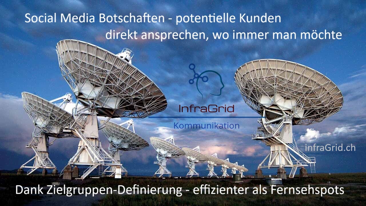 Umfangreiche engmaschige Interessens-Zielgruppen-Kriterien, örtlicher Fokussierung auf Städte, Regionen, Kantone, Bundesländer, Staaten, Kontinente via Infragrid Communicator Konzept.